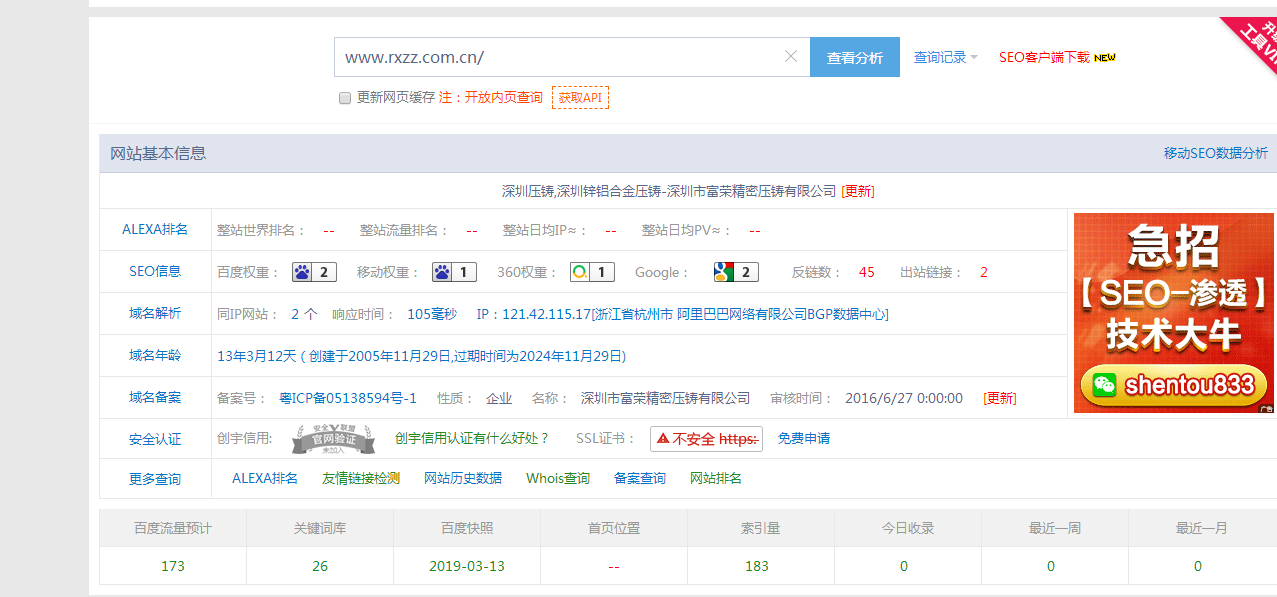 深圳市富榮精密壓鑄有限公司是我們公司的優(yōu)質(zhì)客戶,和我們公司優(yōu)化合作已超過5年了,優(yōu)化的關鍵詞排名非常的穩(wěn)定,其中關鍵詞:壓鑄、鋁合金壓鑄、鋅合金壓鑄、深圳壓鑄、深圳鋁合金壓鑄、深圳鋅合金壓鑄等的排名基本在首頁快照排名,現(xiàn)在每周都有客戶詢盤,來自全國各地的都有,效果很不錯。客戶非常滿意。